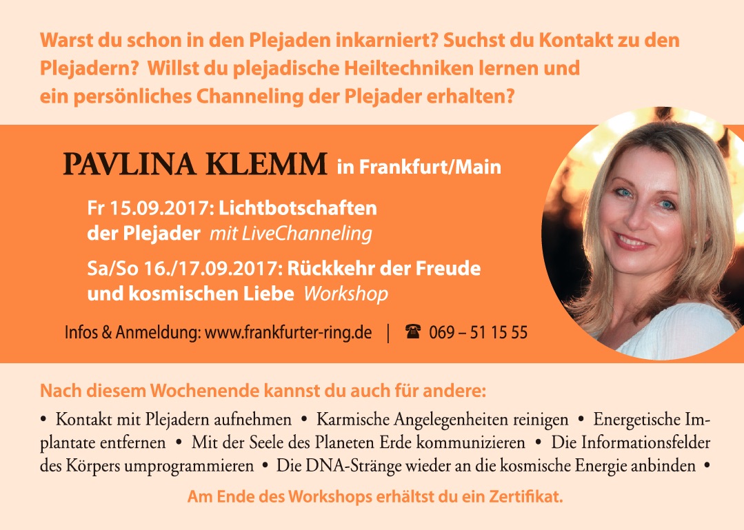 Pavlina Klemm wurde im Jahr 1970 in der Tschechischen Republik im Riesengebirge geboren. Als 19-Jährige kam sie nach München, wo sie heute noch lebt und arbeitet. Schon als kleines Kind hatte sie Kontakt zur Lichtwelt, und als junge Erwachsene war ihr absolut klar, in welche Richtung sich ihr Lebensweg entwickeln würde. 1999, kurz vor der Zeitenwende, begann sie, intensiv mit alternativen Heilmethoden zu arbeiten. Durch die Arbeit mit der heilenden universellen Energie entwickelten sich bei ihr nicht nur heilerische Fähigkeiten, sondern es erhöhte sich auch ihre Anbindung an die Lichtwelt und das Engelreich. Dank dieser Anbindung sieht sie es heute – neben der Arbeit in ihrer Heilpraxis – als ihre größte Aufgabe an, Informationen über die kosmischen und universellen Gesetze weiterzugeben. Das erste Ergebnis ihrer gechannelten Kontakte war Band 1 der »Lichtbotschaften von den Plejaden«.